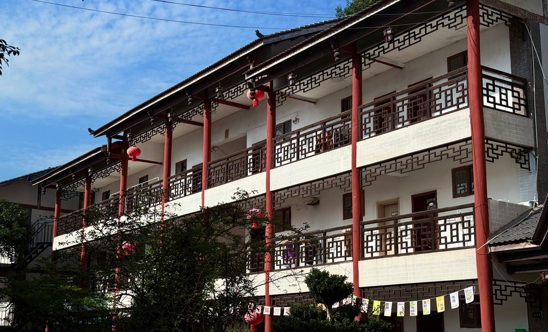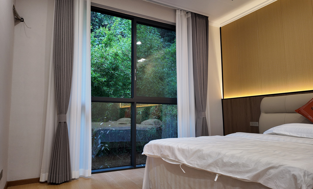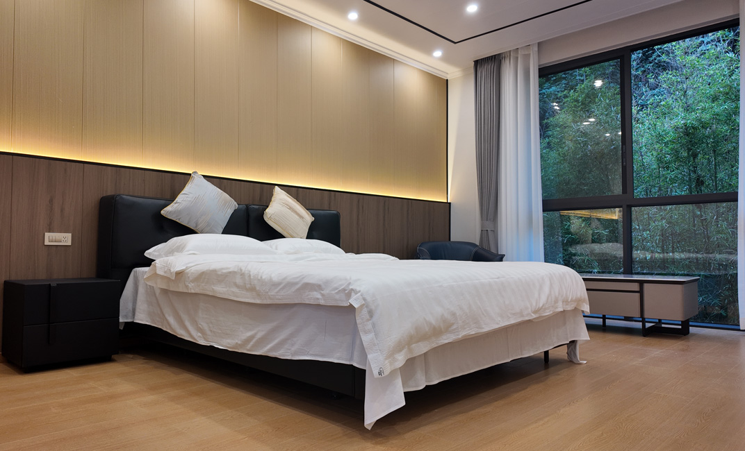住宿区置身于天然资源丰富的森林风景区内,山林环抱、环境幽静宜人,房间以现代化原木配色设计搭配大型窗户外的山野自然风光,让您仿佛置身天然氧吧内悠闲。配置有单人间、双人间、三人间和六人间等多种房型,均含独立淋浴、卫生间。在这里,能让您放下一天的劳累,听宁静如梦,枕明月而眠。